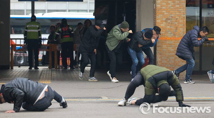 (서울=포커스뉴스) 15일 오후 서울 서초구 고속터미널 광장에서 훈련 참가자들이 시민안전확보를 위한 유관기관 합동 대테러 종합훈련을 하고 있다.