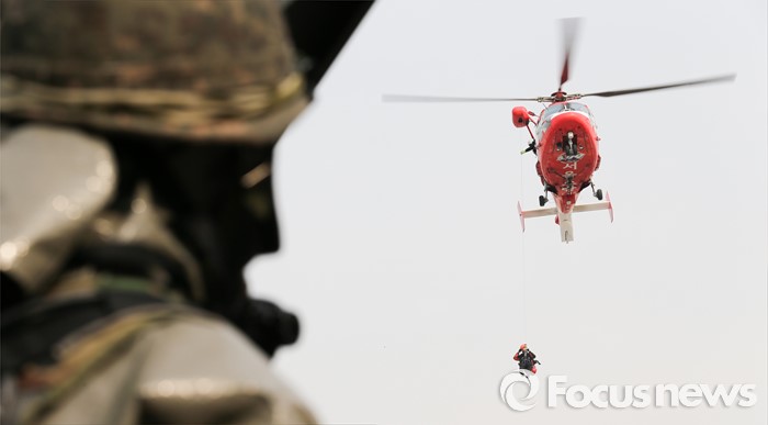 | △ 119 특수구조대원, 부상자 위해 하강 |