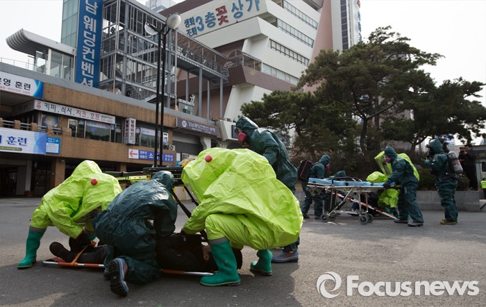 (서울=포커스뉴스) 15일 오후 서울 서초구 고속터미널 광장에서 훈련 참가자들이 시민안전확보를 위한 유관기관 합동 대테러 종합훈련을 하고 있다.