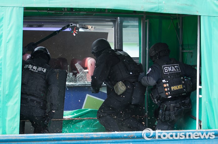 (서울=포커스뉴스) 15일 오후 서울 서초구 고속터미널 광장에서 훈련 참가자들이 시민안전확보를 위한 유관기관 합동 대테러 종합훈련을 하고 있다.