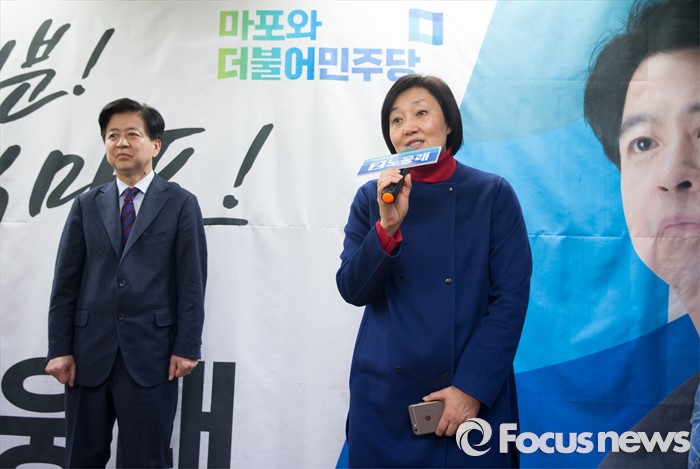 (서울=포커스뉴스) 박영선 더불어민주당 의원이 15일 오후 서울 마포구 백범로 노웅래 의원 선거사무소 개소식에서 축사를 하고 있다.