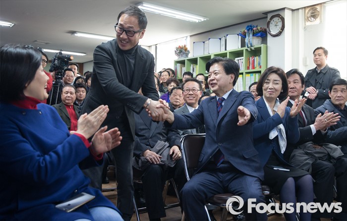 (서울=포커스뉴스) 노웅래 더불어민주당 의원이 15일 오후 서울 마포구 백범로 선거사무소 개소식에서 가수 유열과 인사를 나누고 있다. 왼쪽부터 박영선 의원, 유열, 노웅래 의원