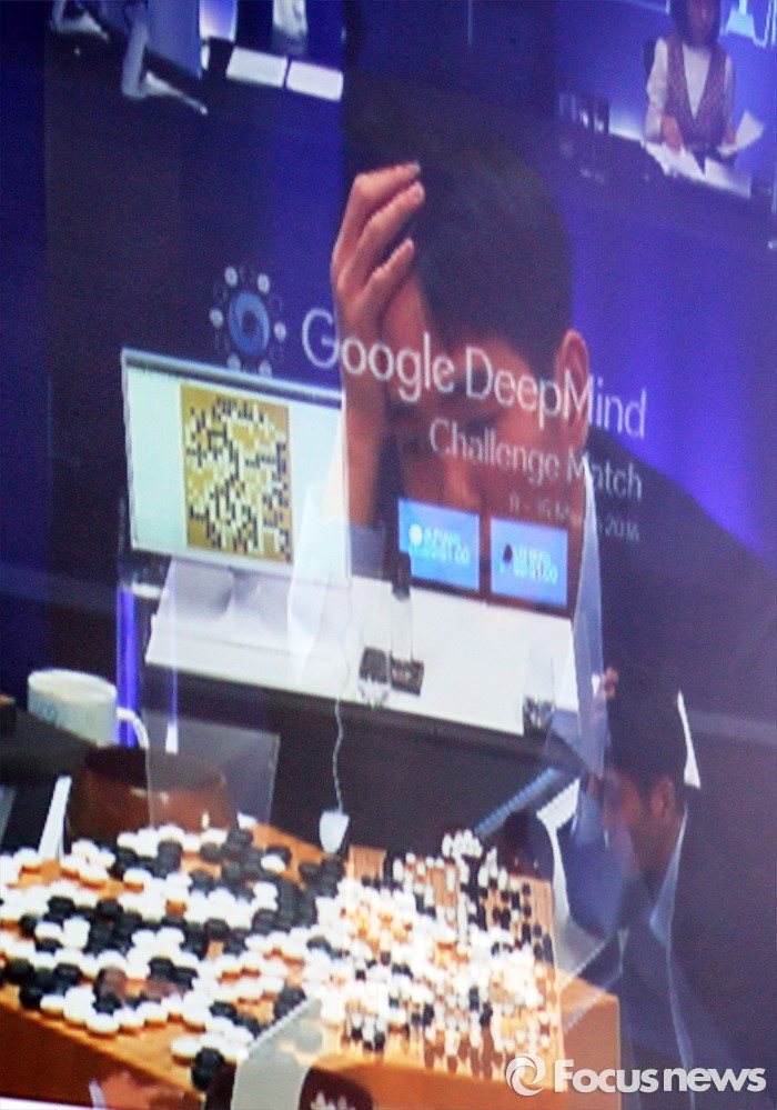 (서울=포커스뉴스) 15일 오후 서울 광화문 포시즌스 호텔에서 열린 구글 딥마인드 챌린지 매치 제5국에서 바둑기사 이세돌 9단이 인공지능 바둑프로그램 알파고에게 돌을 던진 뒤 생각에 잠긴 모습이 대국 해설장 화면에 비치고 있다.