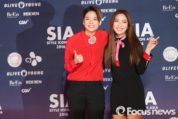 (서울=포커스뉴스) 15일 오후 서울 동대문구 동대문 디자인 플라자에서 열린 '스타일 아이콘 아시아 2016' 에 참석한 가수 엠버(왼쪽)와 루나가 포토타임을 갖고 있다.