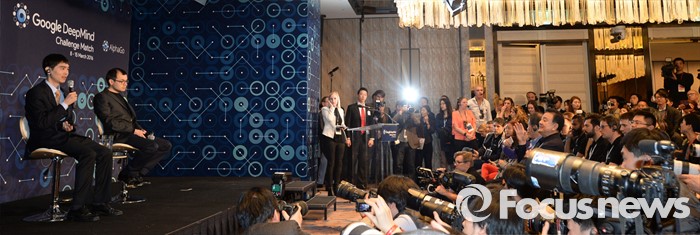 (서울=포커스뉴스) 15일 오후 서울 광화문 포시즌스 호텔에서 열린 구글 딥마인드 챌린지 매치 제5국 기자회견에 참석한 바둑기사 이세돌 9단과 데미스 하사비스 구글 딥마인드 최고경영자가 취재진의 질문에 답하고 있다.