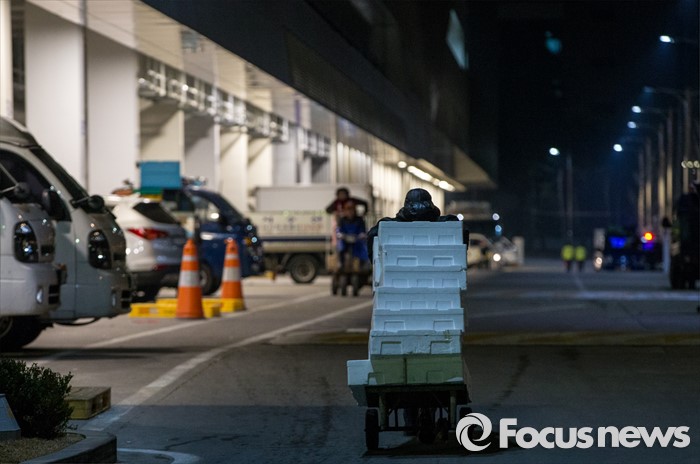 (서울=포커스뉴스) 16일 오전 서울 노량진 수산시장 현대화 건물 경매장에서 한 상인이 첫 경매 준비를 하고 있다. 이날 경매를 시작으로 현대화 건물에서의 개장이 이뤄졌지만, 절반 넘는 상인들이 좁아진 상가 공간과 비싸진 임대료를 주장하며 옛 건물에 남은 채 이전을 거부 중인 상황이다.