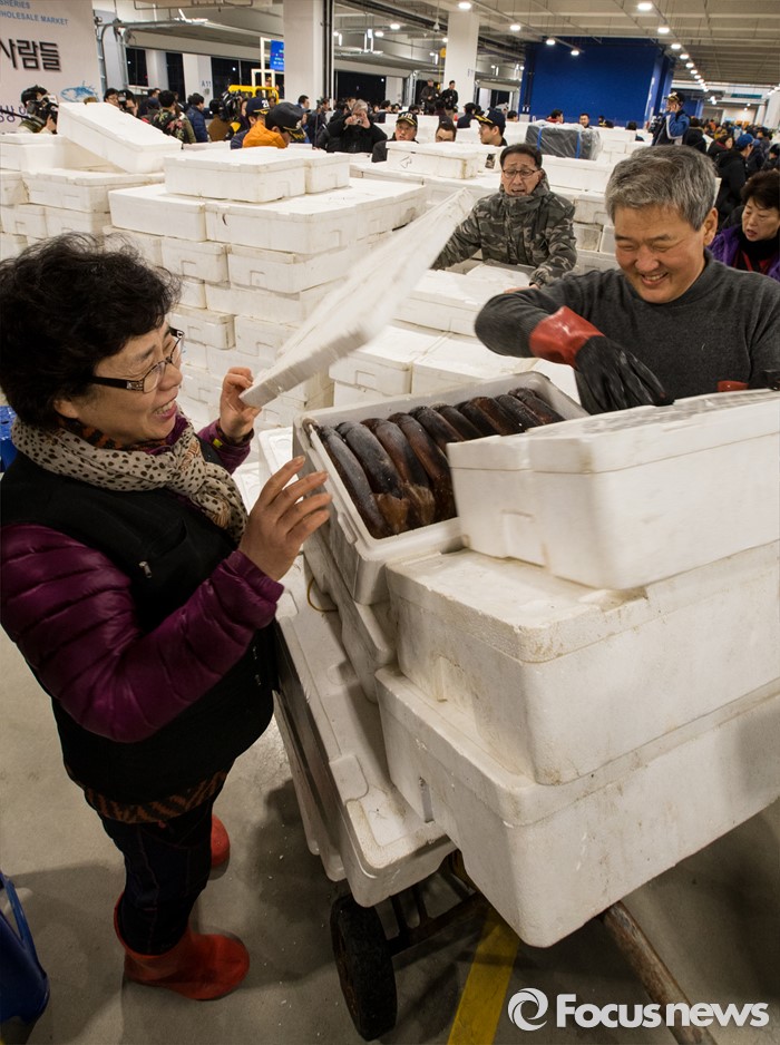 (서울=포커스뉴스) 16일 오전 서울 노량진 수산시장 현대화 건물 경매장에서 상인들이 첫 경매에 낙찰 받은 오징어를 옮기고 있다. 이날 경매를 시작으로 현대화 건물에서의 개장이 이뤄졌지만, 절반 넘는 상인들이 좁아진 상가 공간과 비싸진 임대료를 주장하며 옛 건물에 남은 채 이전을 거부 중인 상황이다.