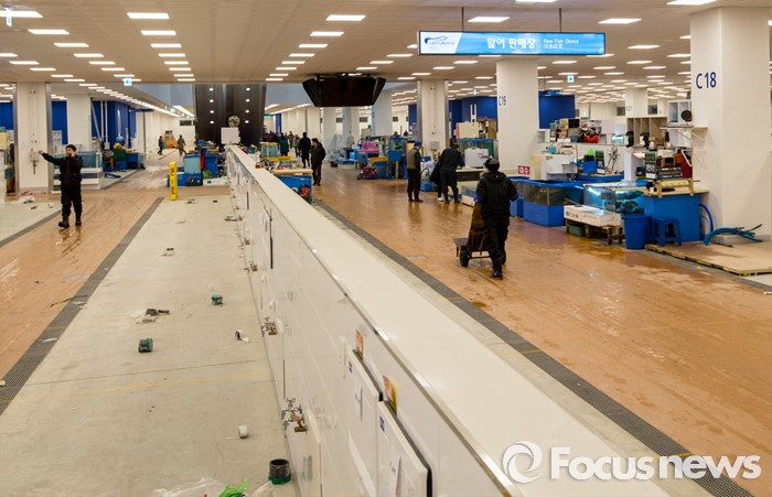 (서울=포커스뉴스) 16일 오전 첫 경매가 열린 서울 노량진 수산시장 현대화 건물의 활어 판매장이 한산한 모습을 보이고 있다. 이날 경매를 시작으로 현대화 건물에서의 개장이 이뤄졌지만, 절반 넘는 상인들이 좁아진 상가 공간과 비싸진 임대료를 주장하며 옛 건물에 남은 채 이전을 거부 중인 상황이다.