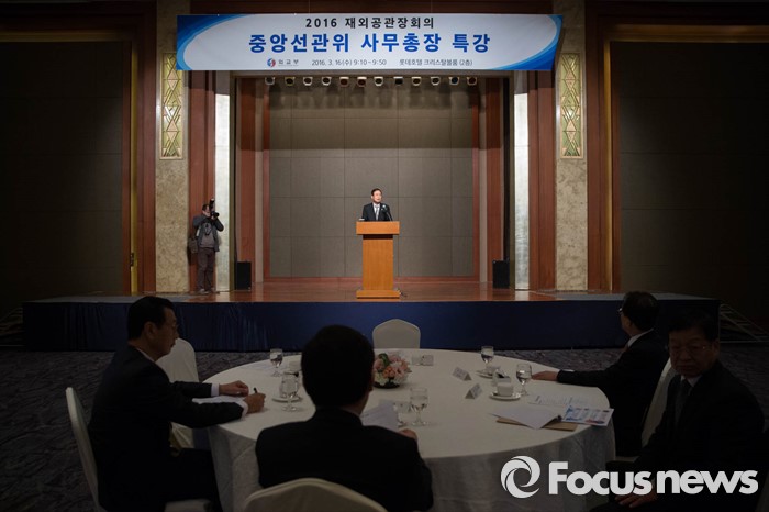 (서울=포커스뉴스) 16일 오전 서울 중구 롯데호텔에서 열린 2016 재외공관장회의- 중앙선관위 사무총장 특강에서 김용희 중앙선관위 사무총장이 참석자들에게 강의를 하고 있다.
