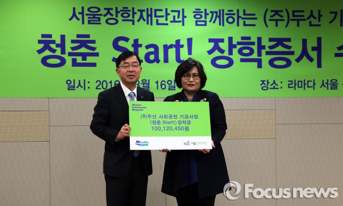 (서울=포커스뉴스) 두산은 16일 서울 중구 라마다호텔 동대문에서 ‘청춘 Start! 장학증서 수여식’을 갖고 1억여원의 장학금을 전달했다고 밝혔다.