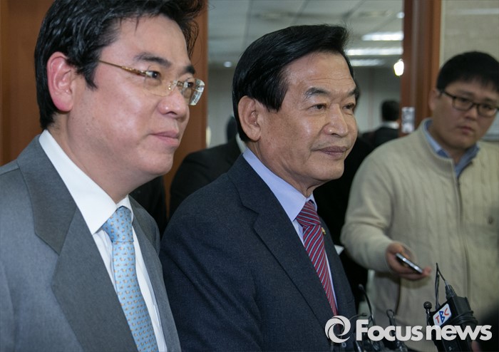 (서울=포커스뉴스) 20대 총선 공천 배제(컷오프)된 서상기(오른쪽), 홍지만 새누리당 의원이 16일 오전 서울 여의도 국회 정론관에서 불출마 선언 및 당 결정 수용 기자회견을 마친 뒤 취재진 질문에 답하고 있다.