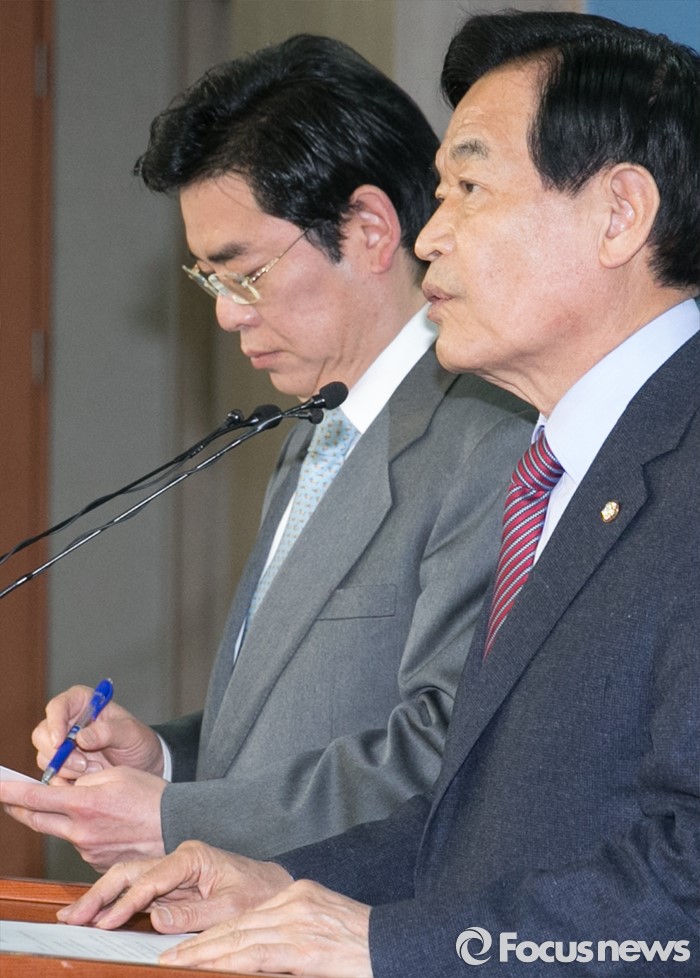 (서울=포커스뉴스) 20대 총선 공천 배제(컷오프)된 서상기(오른쪽), 홍지만 새누리당 의원이 16일 오전 서울 여의도 국회 정론관에서 불출마 선언 및 당 결정 수용 기자회견을 하고 있다.