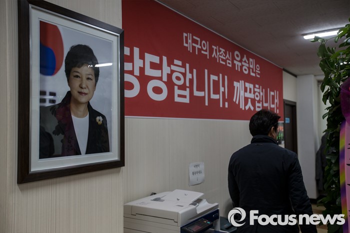 (대구=포커스뉴스) 새누리당이 유승민(대구 동구을) 의원에 대한 공천 배제안을 놓고 고민하고 있는 16일 오전 대구 동구 유 의원 선거사무소에 박근혜 대통령 사진이 걸려 있다.