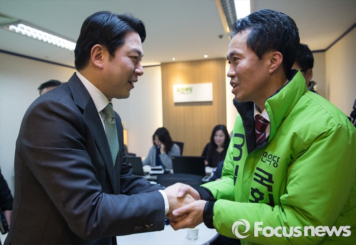 (서울=포커스뉴스) 더불어민주당을 탈당한 후 국민의당에 입당한 정호준 의원(왼쪽)이 16일 오전 서울 마포구 국민의당 당사에서 예비후보와 인사를 하고 있다.