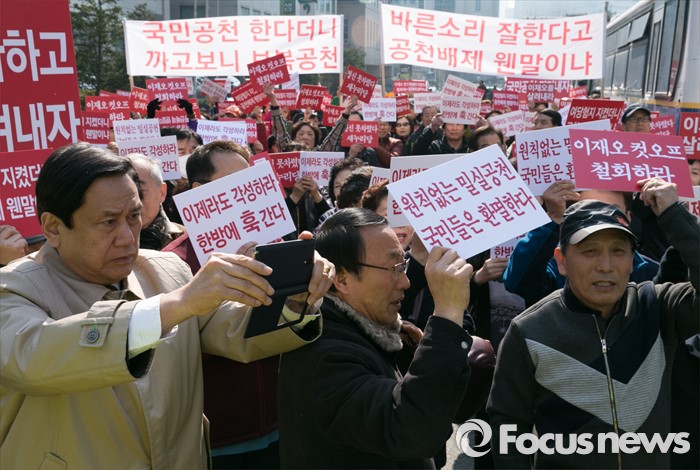 (서울=포커스뉴스) 16일 오전 서울 여의도 새누리당사 앞에서 공천 배제(컷오프)된 이재오 의원의 지지자들이 공천관리위원회의 결정 철회를 촉구하는 집회를 하고 있다.