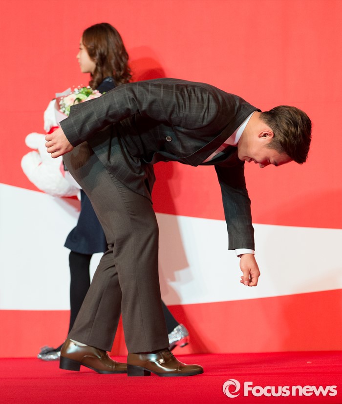 (서울=포커스뉴스) 16일 오전 서울 중구 더플라자호텔 그랜드볼룸에서 제21회 코카콜라 체육대상 시상식에 참석한 스켈레톤 대표 윤성빈이 신인상 수상 세리머니를 하고 있다.