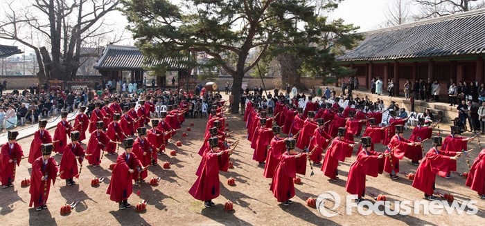 (서울=포커스뉴스) 16일 오전 서울 종로구 성균관 대성전에서 열린 '2016 춘기석전대제'에서 일무보존회 회원들이 일무를 추고 있다.