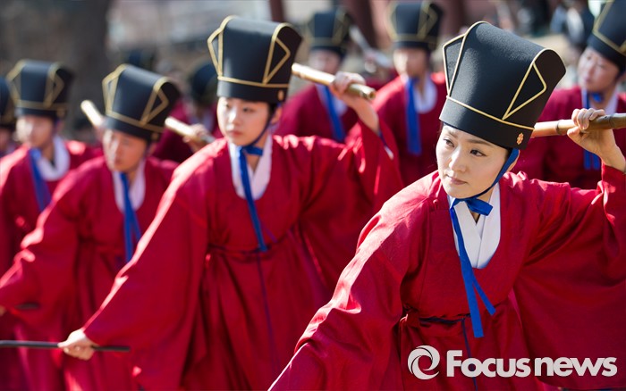 (서울=포커스뉴스) 16일 오전 서울 종로구 성균관 대성전에서 열린 '2016 춘기석전대제'에서 일무보존회 회원들이 일무를 추고 있다.