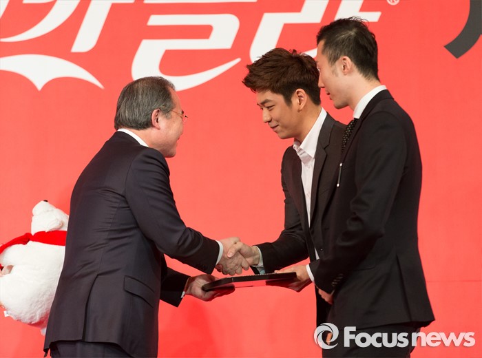 (서울=포커스뉴스) 16일 오전 서울 중구 더플라자호텔 그랜드볼룸에서 제21회 코카콜라 체육대상 시상식에 참석한 이용대(오른쪽 두번째)와 유연성(배드민턴)이 우수단체상을 수상하고 있다.