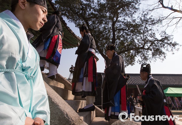 (서울=포커스뉴스) 16일 오전 서울 종로구 성균관 대성전에서 열린 '2016 춘기석전대제'에서 제관들이 월대에 오르고 있다.