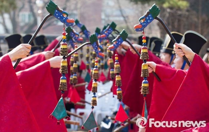 (서울=포커스뉴스) 16일 오전 서울 종로구 성균관 대성전에서 열린 '2016 춘기석전대제'에서 일무보존회 회원들이 일무를 추고 있다.