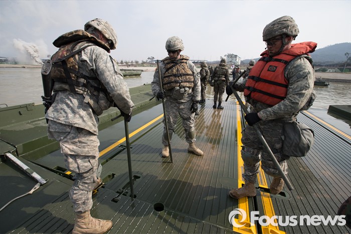 (이천=포커스뉴스) 16일 오전 경기도 이천시 7공병여단 도하훈련장에서 열린 '한·미 연합 소부대 도하훈련'에서 한국군 제7공병여단 도하대대와 미군 제2전투항공여단 공병대대 장병들이 부교를 설치하고 있다.