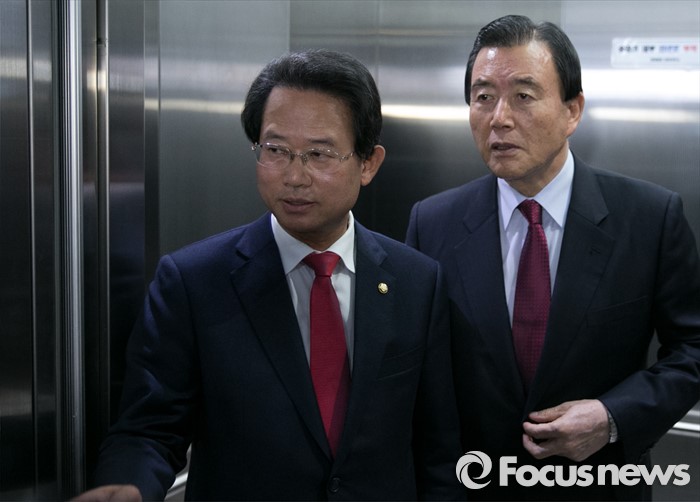(서울=포커스뉴스) 공천 배제(컷오프)된 류성걸(왼쪽) 새누리당 의원이 16일 오후 서울 여의도 당사에서 공천관리위원회의에 참석하는 이한구 위원장을 기다리며 홍문표 위원과 대화하고 있다.