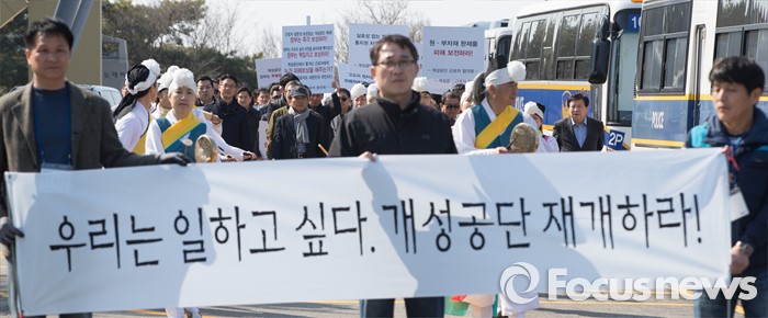 (파주=포커스뉴스) 16일 오후 경기도 파주시 임진각 망배단에서 개성공단 입주기업, 영업기업, 협력기업 등 대표를 비롯한 임직원과 가족들이 '개성공단 평화대행진 집회'를 마치고 통일대교로 향하고 있다.