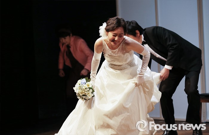 (서울=포커스뉴스) 16일 오후 서울 종로구 미마지아트센터 눈빛극장에서 열린 연극 '두 코리아의 통일' 프레스콜에 참석한 배우 성여진이 주요장면을 시연하고 있다.