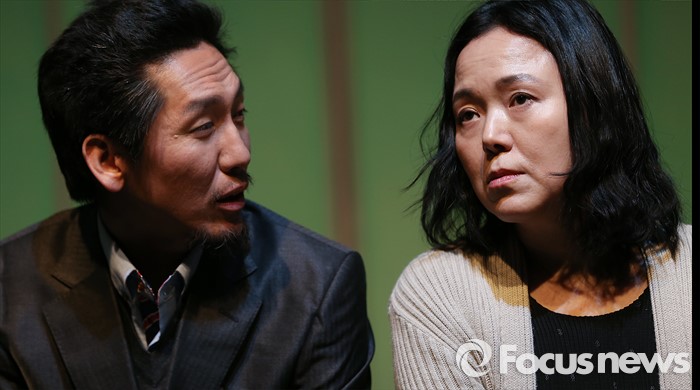 (서울=포커스뉴스) 16일 오후 서울 종로구 미마지아트센터 눈빛극장에서 열린 연극 '두 코리아의 통일' 프레스콜에 참석한 배우 전중용(왼쪽)과 박현미가 주요장면을 시연하고 있다.