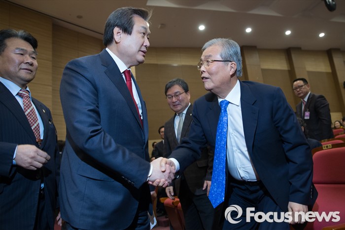 (서울=포커스뉴스) 김무성 새누리당 대표(왼쪽)와 김종인 더불어민주당 대표가 16일 오후 서울 여의도 국회 의원회관에서 열린 '자영업자 정책연대 및 생존권 사수 출정식'에 참석해 인사를 나누고 있다.
