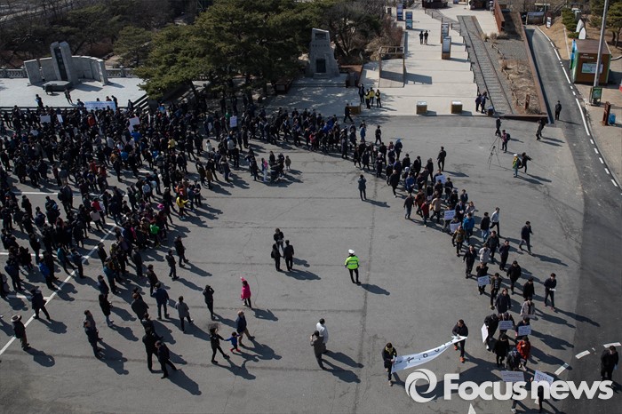 (파주=포커스뉴스) 16일 오후 경기도 파주시 임진각 망배단에서 개성공단 입주기업, 영업기업, 협력기업 등 대표를 비롯한 임직원과 가족들이 '개성공단 평화대행진'을 하고 있다.