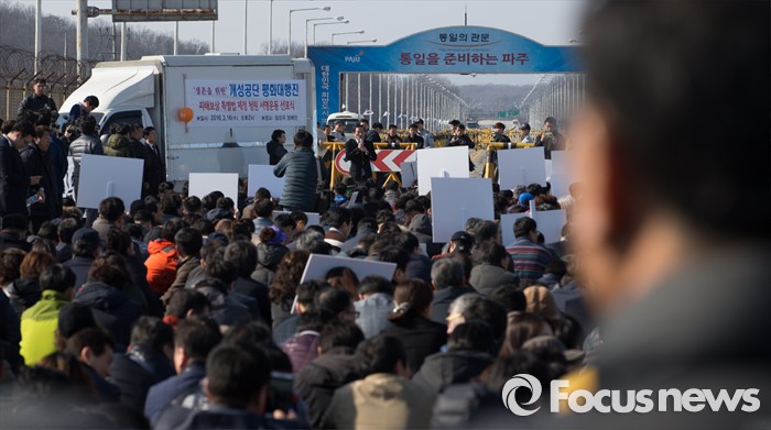 (파주=포커스뉴스) 16일 오후 경기도 파주시 통일대교에서 개성공단 입주기업, 영업기업, 협력기업 등 대표를 비롯한 임직원과 가족들이 '개성공단 평화대행진 집회'를 하고 있다.