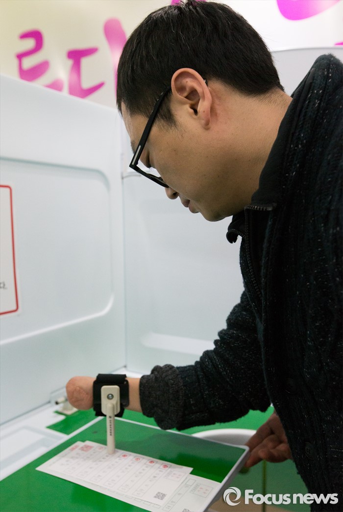 (서울=포커스뉴스) 16일 오후 서울 영등포구 이룸센터에서 열린 '20대 총선 거동불편유권자 대상 사전투표 모의 체험행사'에 참석한 장애인 유권자가 손목활용형 기표용구로 투표 시연을 하고 있다.