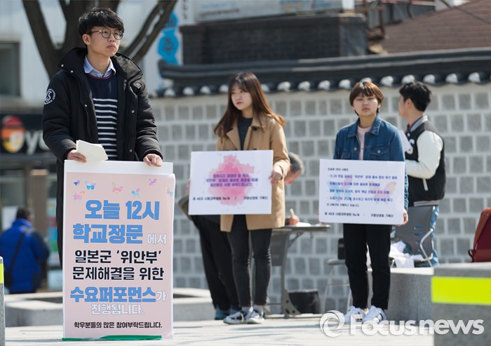 (서울=포커스뉴스) 16일 오후 서울 종로구 성균관대학교 정문 앞에서 재학생들이 일본군 위안부 문제해결을 위한 서명운동을 하고 있다.