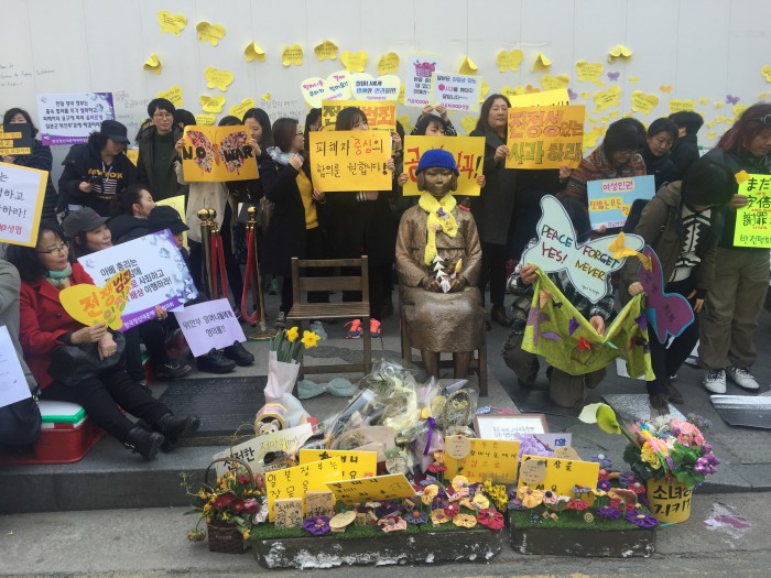 16일 서울 종로구 옛 일본대사관 앞에서 열린 제1222차 정기 수요집회에서 한국염 정대협 공동대표는 “최근 유엔 여성차별철폐위원회는 위안부 합의에 관한 일본정부의 대응이 미흡하다는 결의안을 발표했다”며 당시 합의가 졸속으로 이뤄졌음을 강조했다.