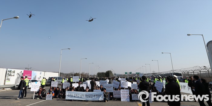 (파주=포커스뉴스) 16일 오후 경기도 파주시 통일대교에서 개성공단 입주기업, 영업기업, 협력기업 등 대표를 비롯한 임직원과 가족들이 '개성공단 평화대행진 집회'를 하고 있다.