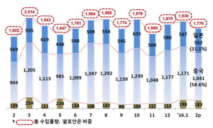 2월 전체 수입의 58.6%를 차지한 중국산 철강재 수입은 104만1000톤으로 전년동월 대비 15.2% 증가했다. 반면 2월 전체 수입의 31.1%를 차지하는 일본산 철강재 수입은 55만2000톤으로 지난해 같은 기간 대비 3.0% 감소했다.