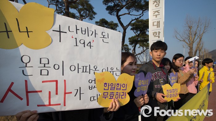 (청주=포커스뉴스) 16일 오후 충북 청주시 청원구 청주대학교 정문 앞에서 열린 일본군 위안부 문제 해결을 위한 1222차 학내 동시다발 수요시위에서 학생들이 한일 위안부 합의를 반대하는 피켓을 들고 있다.