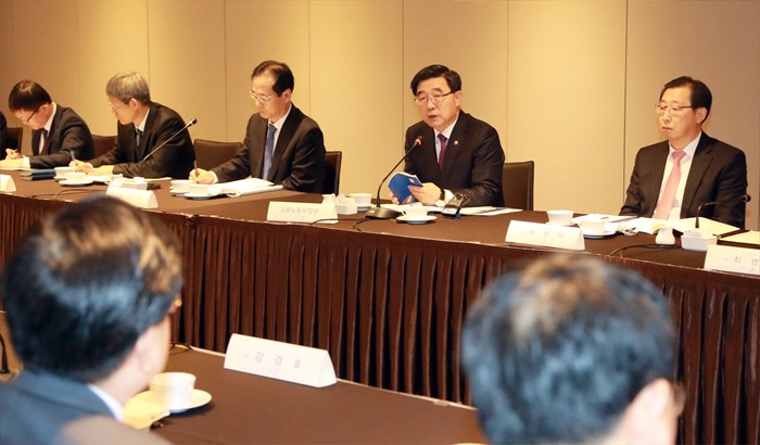 (서울=포커스뉴스) 이기권 고용노동부 장관이 16일 오전 서울 더플라자호텔(4층오키드홀)에서 현대차・기아차・한국GM등 자동차 업종 14개 기업 CEO들과 간담회를 갖고 있다. <사진제공=고용노동부>