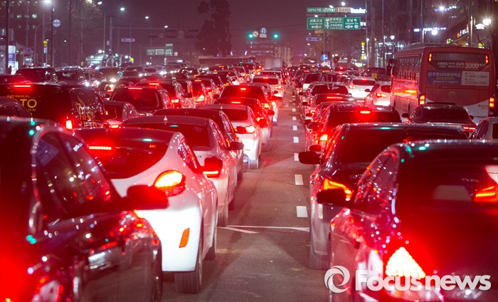 심야 콜버스는 스마트폰 앱을 이용해 출발지, 도착지 등을 입력하고 버스를 부르면 실시간으로 경로를 파악해 운행하는 수요응답형 교통서비스다. 2015년 콜버스랩이 법인을 설립하고 서비스를 시작했다. 콜버스랩이 강남구에서 심야 콜버스를 무료 시범 운행하며 서울택시조합과 갈등을 빚어왔다.(서울=포커스뉴스) 콜버스랩과 택시조합들은 16일 서울 송파구 교통회관에서 기자간담회를 갖고 다음달 중순부터 심야 콜버스를 시범 운영하기로 합의했다. 사진은 지난해 12월 24일 오후 서울 서초구 반포대로에서 반포IC 방면으로 가는 도로가 정체된 모습. 김흥구 기자