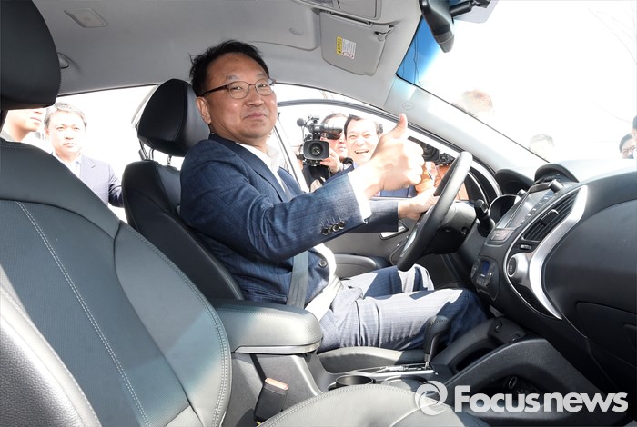 (광주=포커스뉴스) 유일호 부총리 겸 기획재정부 장관이 16일 지역전략산업 육성을 위한 규제프리존 도입과 관련 광주광역시를 첫 현장 방문, 그린카진흥원 수소융합스테이션에서 전기차를 시승하고 있다. <사진제공=기획재정부>