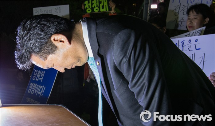 (서울=포커스뉴스) 20대 총선에서 공천배제된 정청래 더불어민주당 의원이 16일 오후 서울 여의도 당사 앞에서 기자회견을 가진 후 지지자들에게 허리 숙여 인사하고 있다.