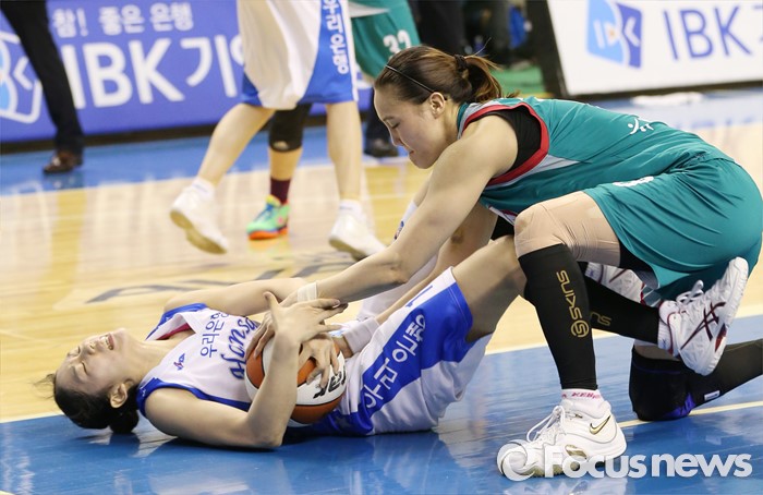 (춘천=포커스뉴스) 춘천호반체육관에서 열린 2015~2016 여자프로농구 우리은행-KEB하나 챔피언결정전 1차전에서 KEB하나 김정은이 우리은행 이승아의 볼을 뺏으려 잡고 있다.