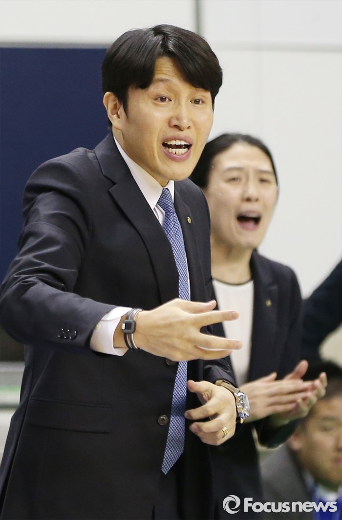 (춘천=포커스뉴스) 춘천호반체육관에서 열린 2015~2016 여자프로농구 우리은행-KEB하나 챔피언결정전 1차전에서 우리은행 위성우 감독이 긴박한 표정으로 선수들을 독려하고 있다.