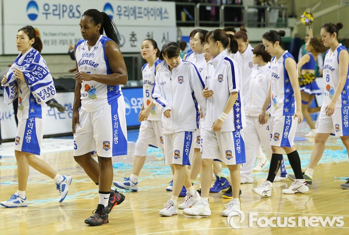 (춘천=포커스뉴스) 춘천호반체육관에서 열린 2015~2016 여자프로농구 우리은행-KEB하나 챔피언결정전에서 KEB하나를 물리치고 1차전을 승리한 우리은행 선수들이 코트를 빠져 나가고 있다.