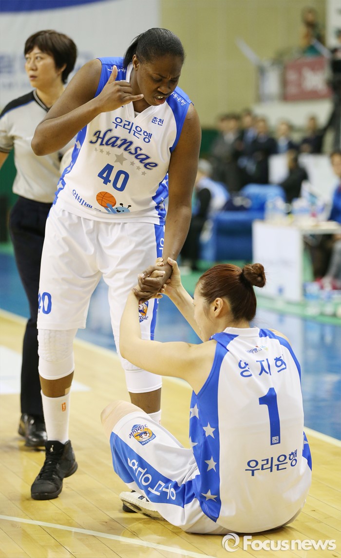 (춘천=포커스뉴스) 춘천호반체육관에서 열린 2015~2016 여자프로농구 우리은행-KEB하나 챔피언결정전 1차전에서 우리은행 스트릭렌이 넘어진 양지희를 일으켜 주고 있다.