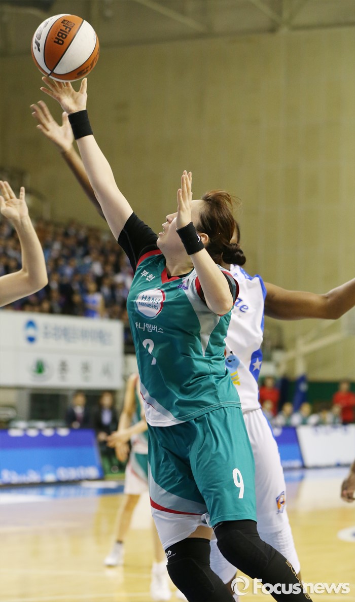 (춘천=포커스뉴스) 춘천호반체육관에서 열린 2015~2016 여자프로농구 우리은행-KEB하나 챔피언결정전 1차전에서 KEB하나 백지은이 우리은행 스트릭렌의 마크를 뚫고 레이업슛을 쏘고 있다.