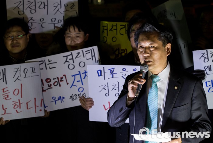 (서울=포커스뉴스) 20대 총선에서 공천배제된 정청래 더불어민주당 의원이 16일 오후 서울 여의도 당사 앞에서 가진 기자회견에서 자신의 거취를 밝히고 있다.