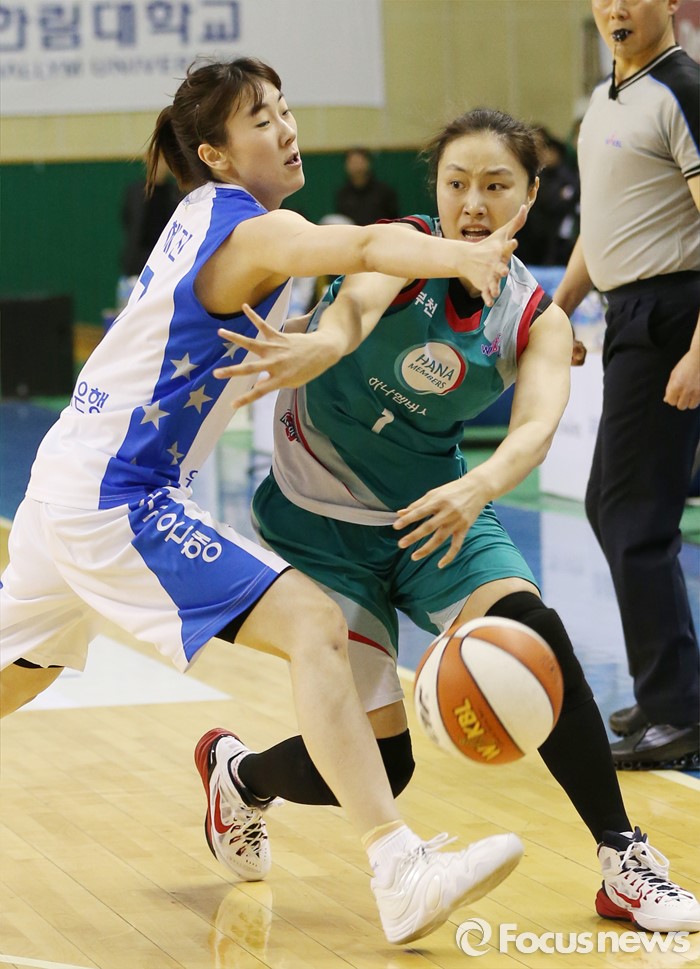 (춘천=포커스뉴스) 춘천호반체육관에서 열린 2015~2016 여자프로농구 우리은행-KEB하나 챔피언결정전 1차전에서 KEB하나 염윤아가 우리은행 박혜진의 마크에 앞서 패스하고 있다.
